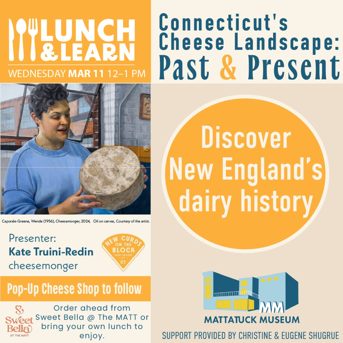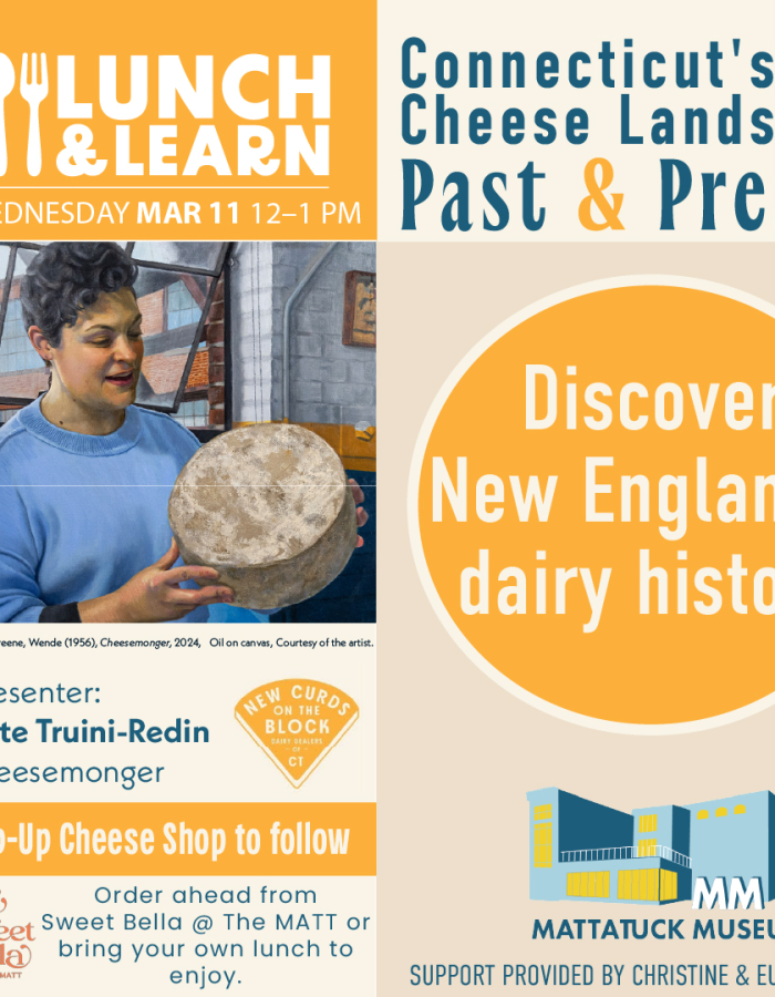 Hear from a local cheesemonger about New England’s rich dairy history and learn about the Connecticut cheesemakers that are currently leading the artisan American cheese movement. Kate Redin, owner of New Curds on the Block cheese shop in Oakville, will walk us through the region’s lesser-known cheese history and its active contemporary landscape. After the talk, join Kate for a Pop-Up Cheese Shop and have the opportunity to purchase cheeses from regional dairies and cheesemakers.
