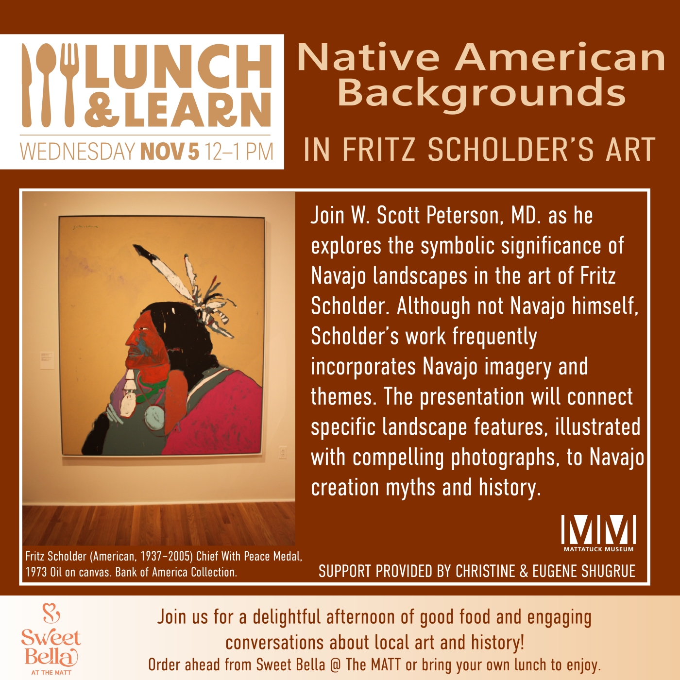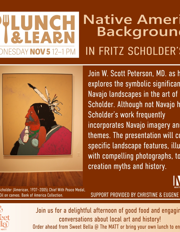 Join W. Scott Peterson, M.D., as he explores the symbolic significance of Navajo landscapes in the art of Fritz Scholder. Although not Navajo himself, Scholder’s work frequently incorporates Navajo imagery and themes. The presentation will connect specific landscape features, illustrated with compelling photographs, to Navajo creation myths and history.