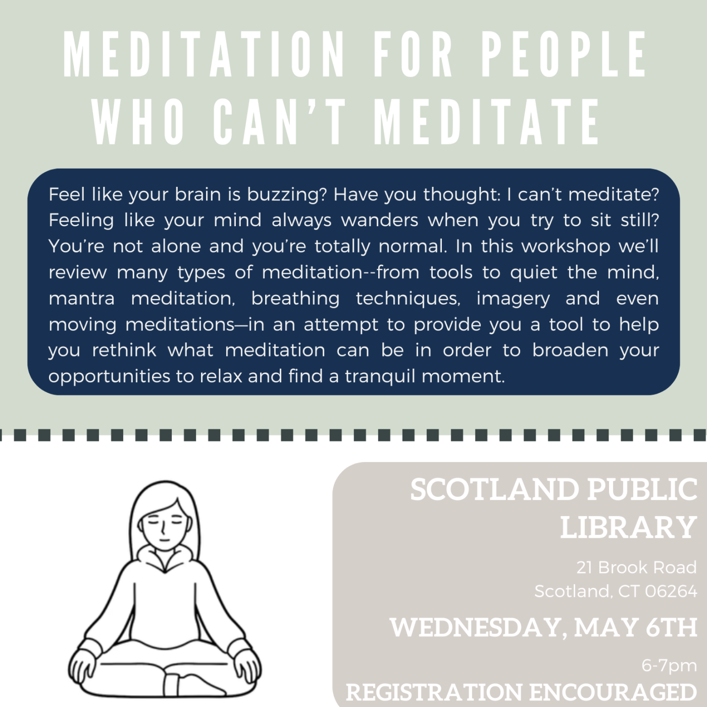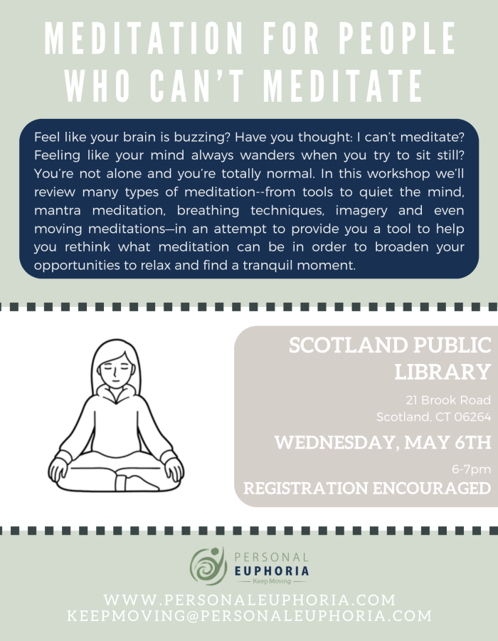 Feel like your brain is buzzing? Have you thought: I can’t meditate? Feeling like your mind always wanders when you try to sit still? You’re not alone and you’re totally normal. In this workshop we’ll review many types of meditation--from tools to quiet the mind, mantra meditation, breathing techniques, imagery and even moving meditations—in an attempt to provide you a tool to help you rethink what meditation can be in order to broaden your opportunities to relax and find a tranquil moment.
