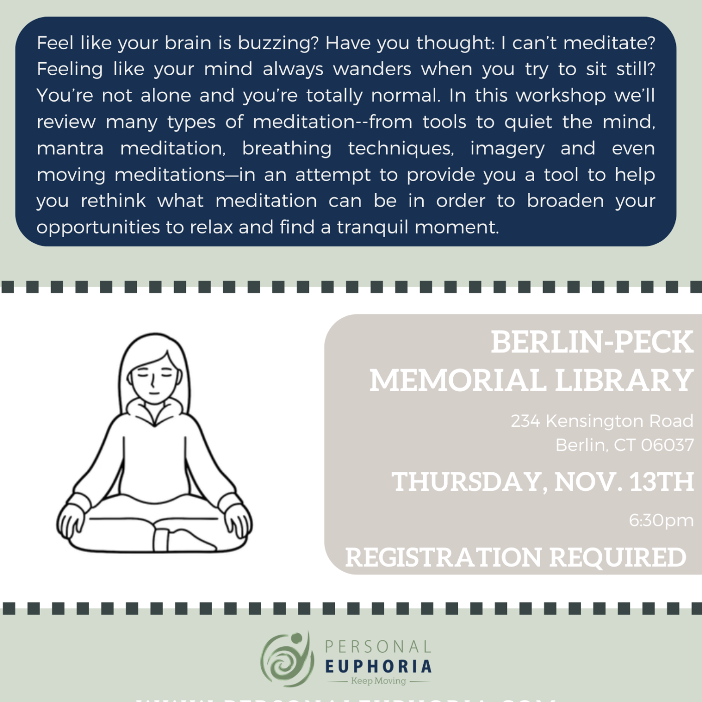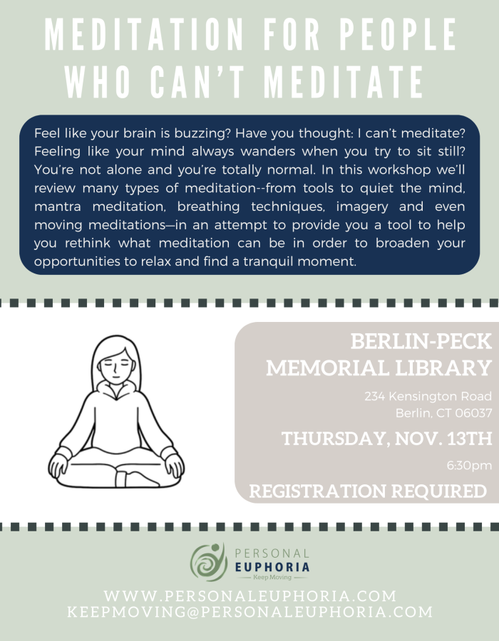 Feel like your brain is buzzing? Have you thought: I can’t meditate? Feeling like your mind always wanders when you try to sit still? You’re not alone and you’re totally normal. In this workshop we’ll review many types of meditation--from tools to quiet the mind, mantra meditation, breathing techniques, imagery and even moving meditations—in an attempt to provide you a tool to help you rethink what meditation can be in order to broaden your opportunities to relax and find a tranquil moment.