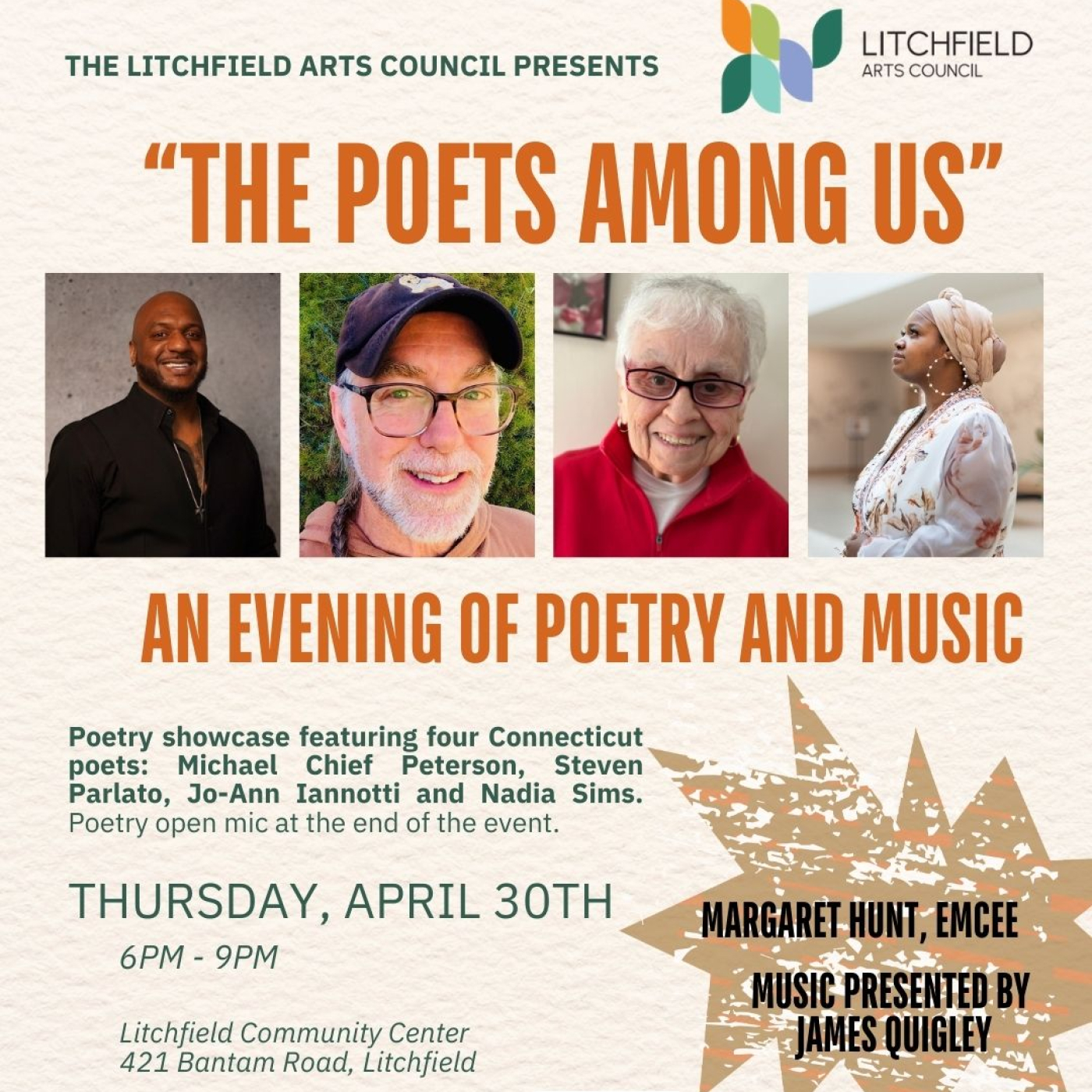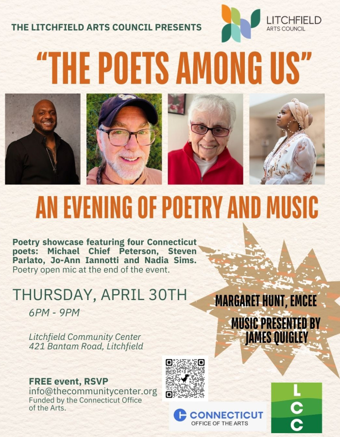 The event will feature four Connecticut poets: Michael Chief Peterson, poet laureate of New Britain; Nadia Sims, poet laureate of Manchester; artist and poet Steven Parlato of Middlebury; and poet and photographer Jo-Ann Iannotti of Litchfield. Margaret Hunt of Litchfield will emcee the event. Music will be presented by Lakeview High student, James Quigley, from 6-6:45 PM.