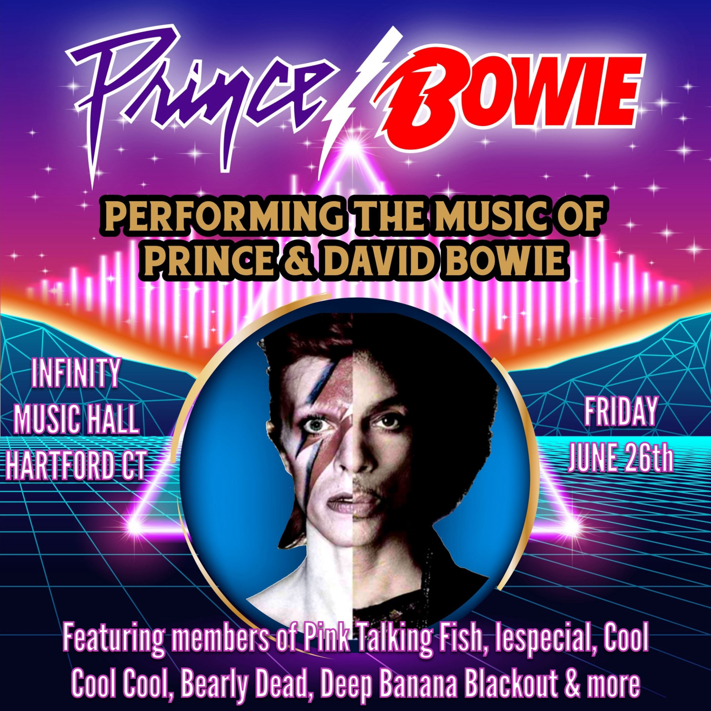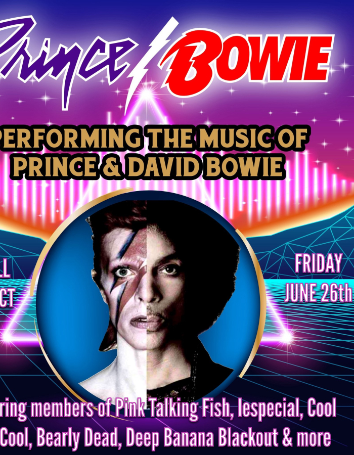 Prince/Bowie is a tribute fusion band that combines the music of Prince and David Bowie into a high energy live show. It features an Allstar cast of characters from various national acts including Pink Talking Fish, lespecial, Cool Cool Cool, Bearly Dead, Deep Banana Blackout and more. This band was created by Eric Gould, the founder of Pink Talking Fish, who has specialized in producing acts that add a unique flavor to the Tribute Genre. The mix of the Prince and David Bowie songbooks blend beautifully and an extra spice is added with master composer, Matt Wayne, creating unique horn arrangements that enhance the music in an exceptional way.