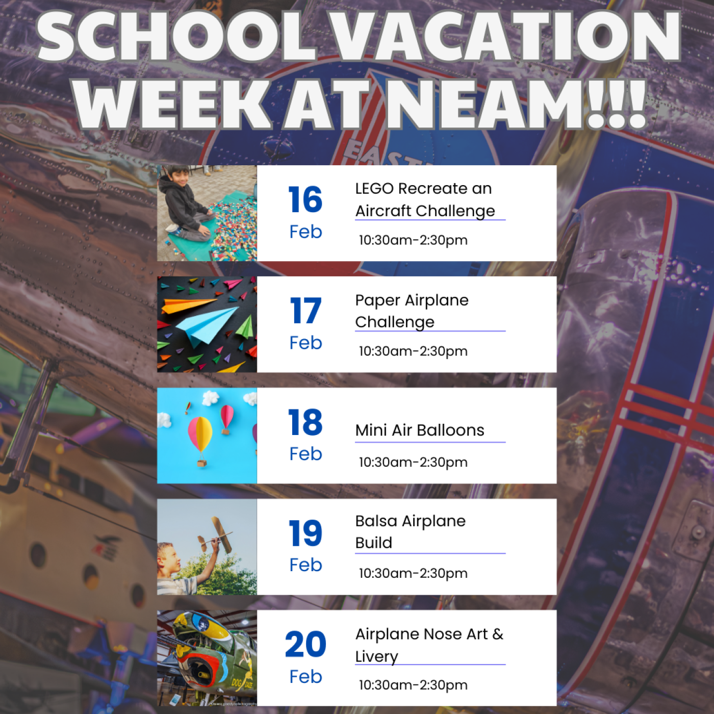 Join us February 16–20 for daily hands-on activities and special programs happening 10:30 AM–2:30 PM. Every day brings something new to explore—perfect for curious kids, aviation fans, and families looking for high-flying fun!