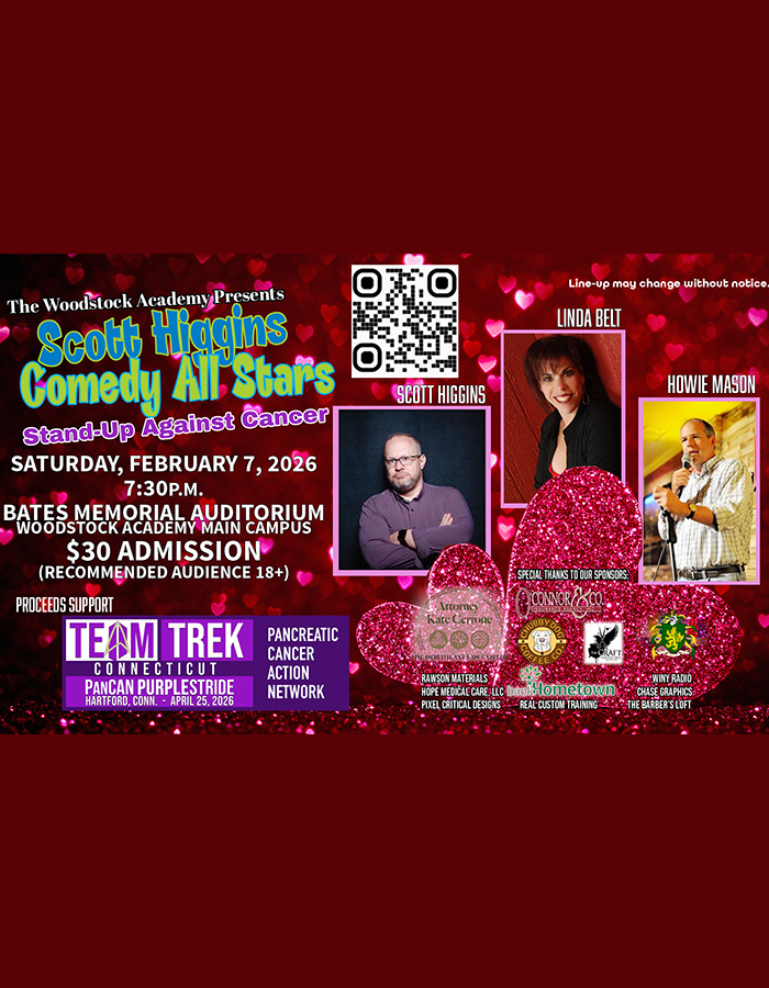 Scott Higgins Comedy All Stars is coming to the Woodstock Academy, and they're looking to Stand-Up Against Cancer one joke at a time! Join Scott and his fellow comedians Howie Mason and Linda Belt on February 7th at 7:30p.m. at the Woodstock Academy Bates Memorial Auditorium on their Main Campus (57 Academy Road, Woodstock, CT) and help raise money for Pancreatic Cacner Research to benefit the Pancreatic Cancer Action Network's PURPLESTRIDE Event!
