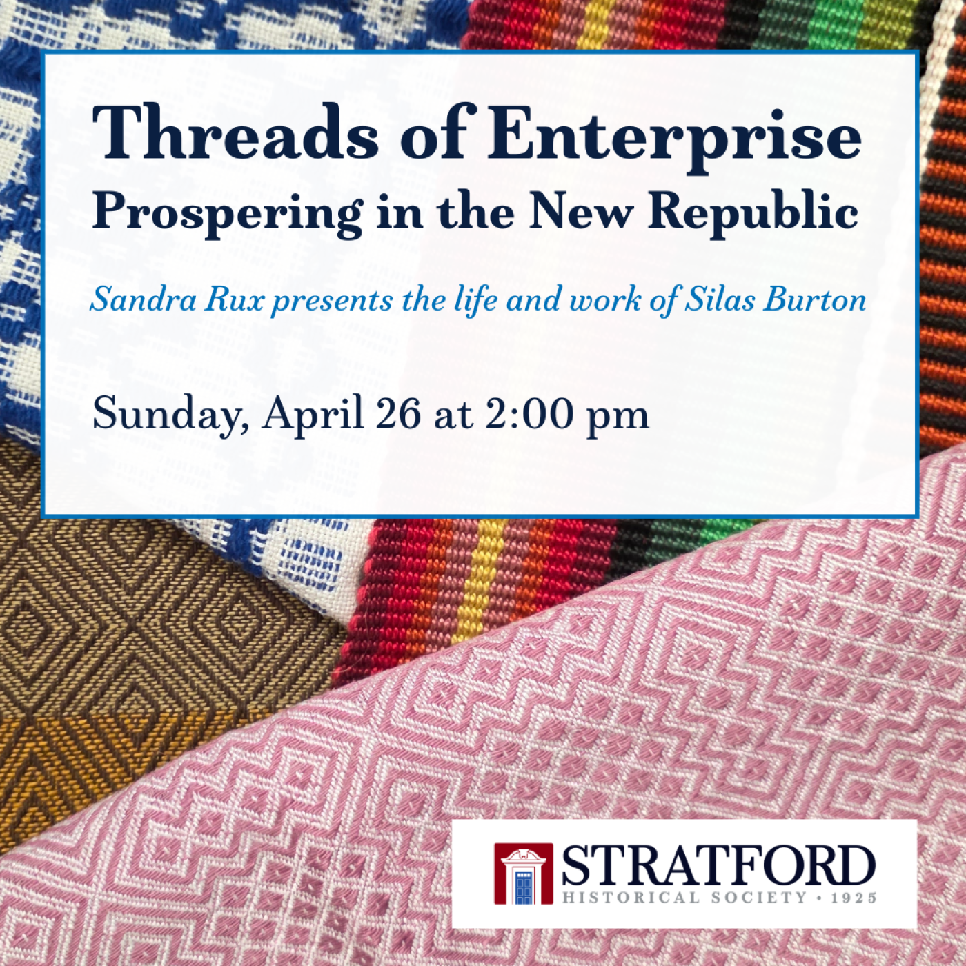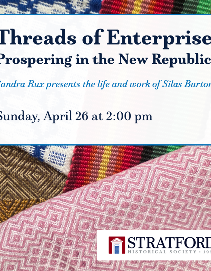 Join us on Sunday, April 26 at 2:00 pm for "Threads of Enterprise: Prospering in the New Republic"—Sandra Rux presents the life and work of Silas Burton.