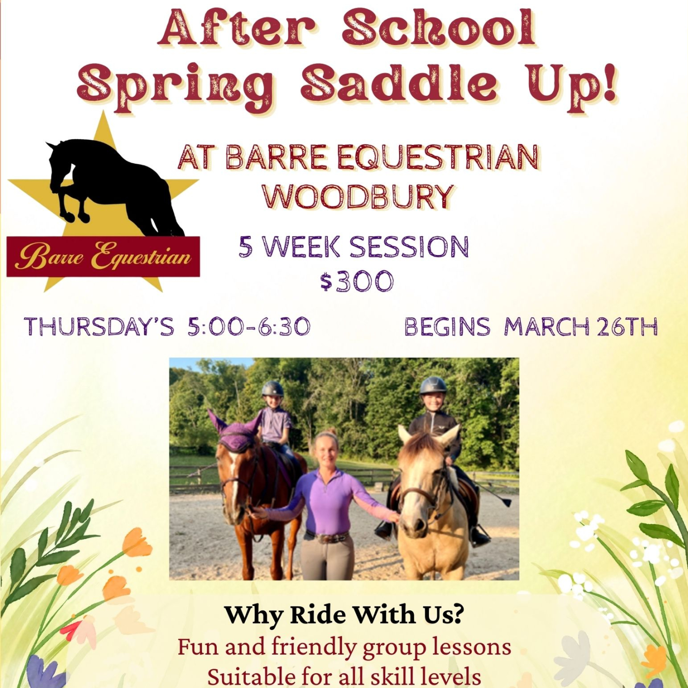 Join us for fun and friendly group riding lessons every Thursday from 5:00 to 6:30 PM starting March 26! Open to all skill levels, this program helps riders build confidence and skills while making new friends. Each lesson includes hands-on basics of horse care—like tacking, untacking, and grooming—along with saddle time. Perfect for kids ready to enjoy spring outdoors and connect with horses!