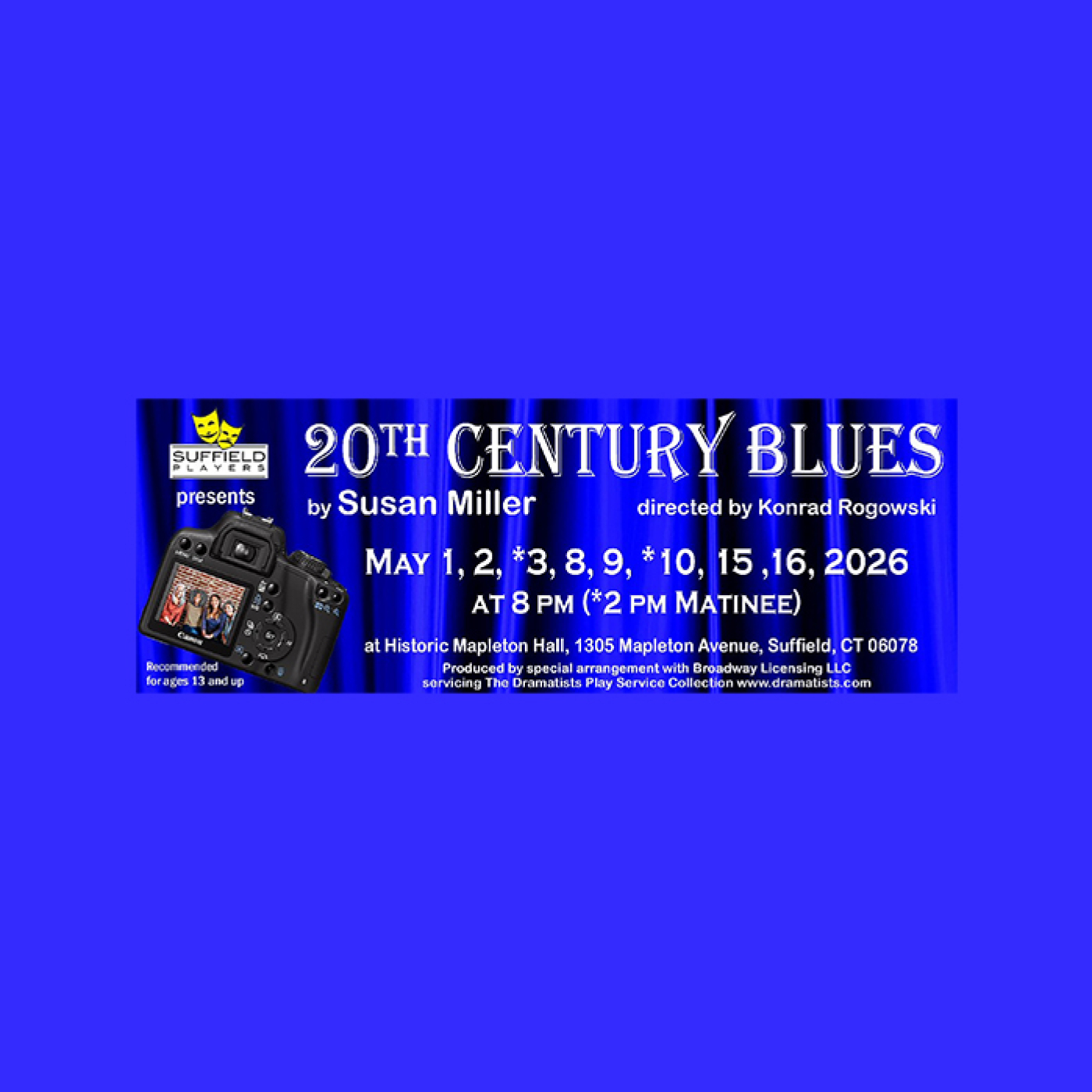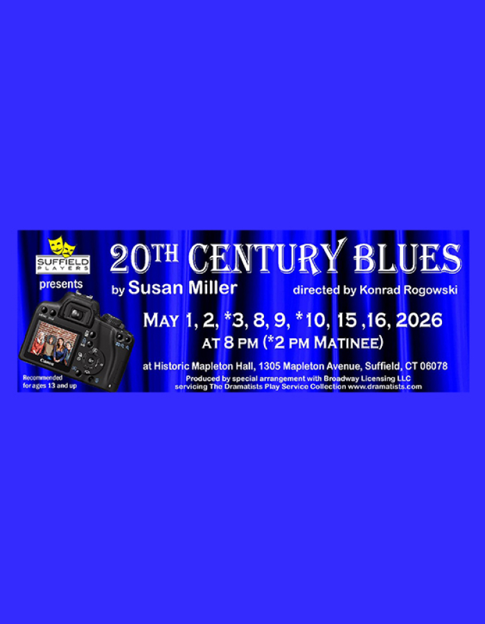 The Suffield Players proudly present 20th Century Blues by Susan Miller, a heartfelt and humorous exploration of friendship, memory, and the passage of time. Directed by Konrad Rogowski, this moving dramatic comedy runs May 1–16, 2026 at Mapleton Hall in Suffield.