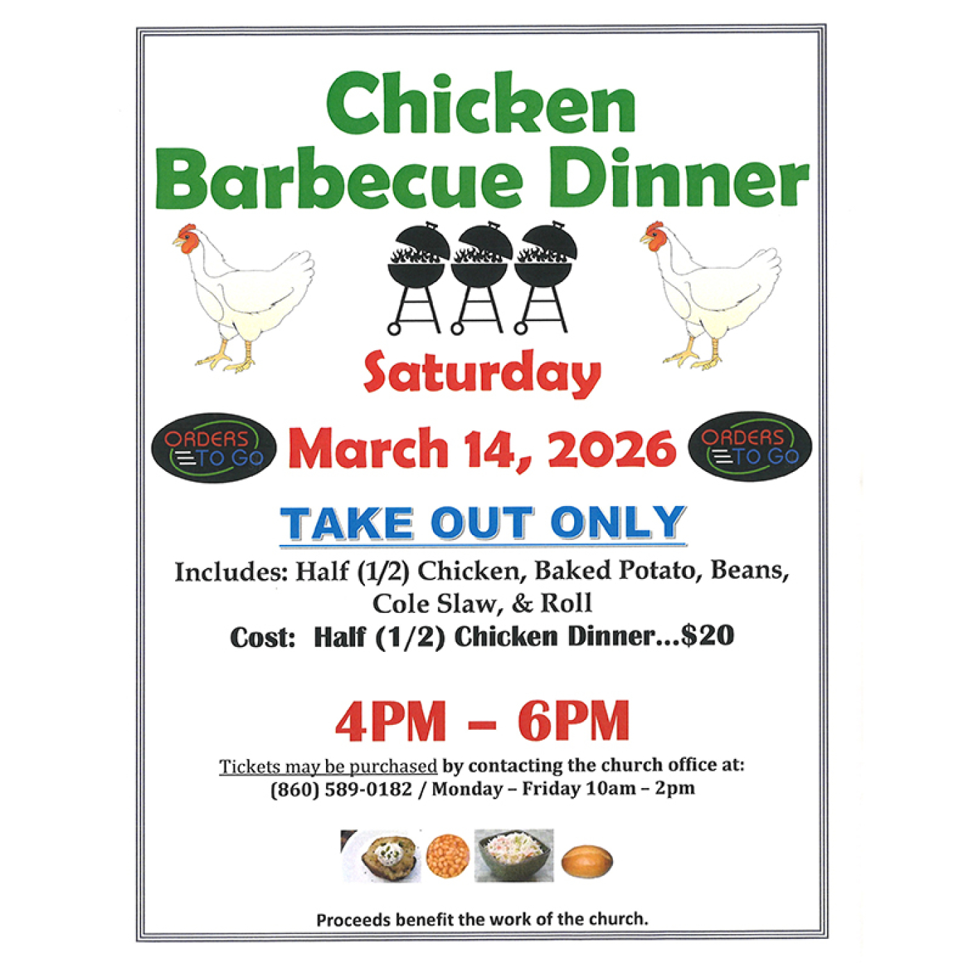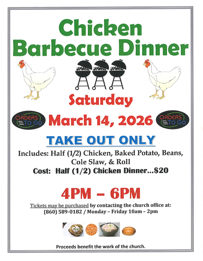 Join us a Terryville Congregational Church for a Chicken BBQ Dinner on Saturday, March 14, 2026. Take out only from 4pm to 6pm. Dinner includes half a BBQed chicken, baked potato, beans, coleslaw, and a roll. $20/person. The church is located at 233 Main St. Terryville, CT 06786. To purchase tickets contact the church office at 860 589-0182. Thank you!