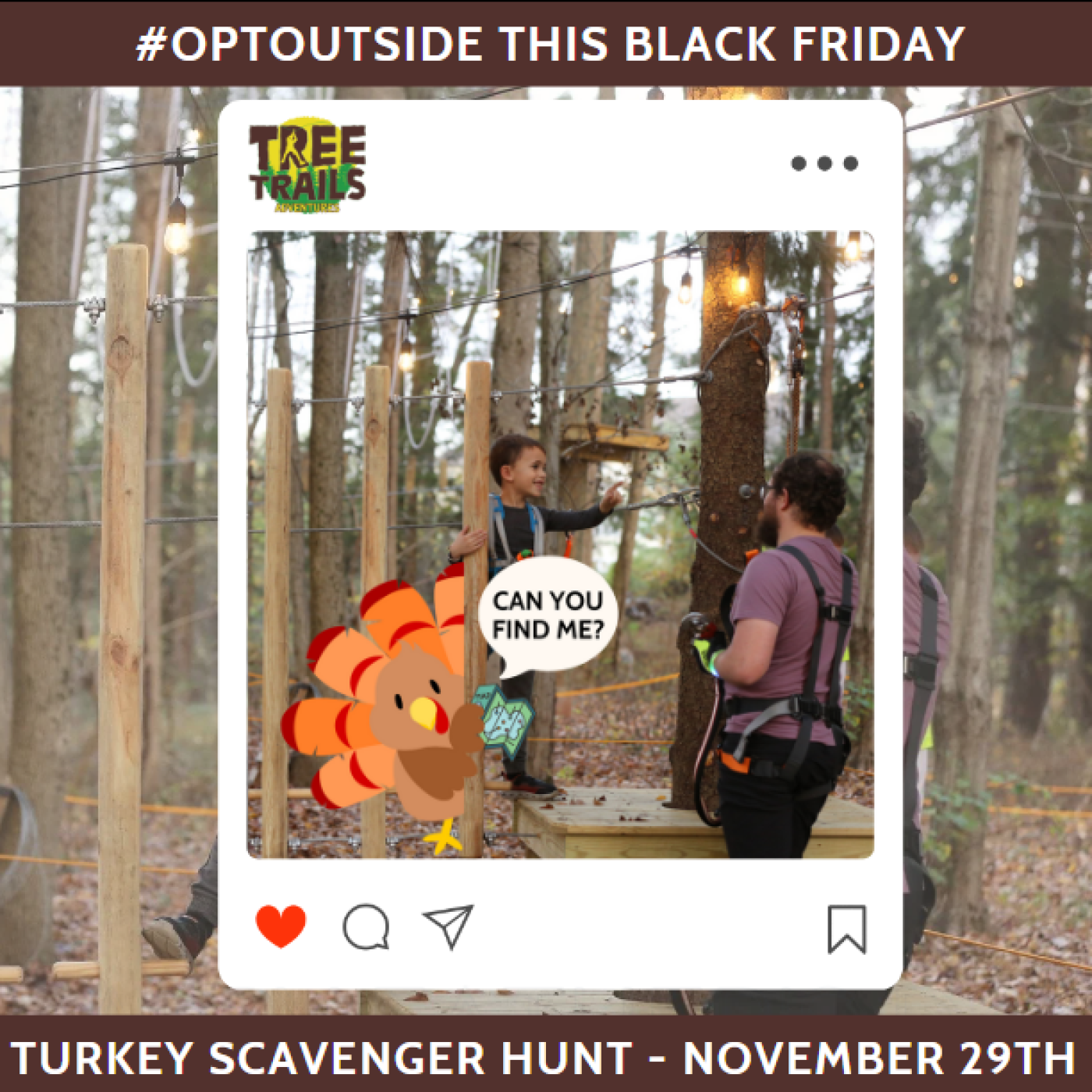 Black Friday is the perfect day to shake a leg – and we’re not talking about drumsticks here! Bring the family to TreeTrails for outdoor fun. You’ll banish your turkey trance and work off that extra piece of pumpkin pie as you climb through the trees in the fresh air. Join us Friday, November 27 from 10am-4pm for festive fun.