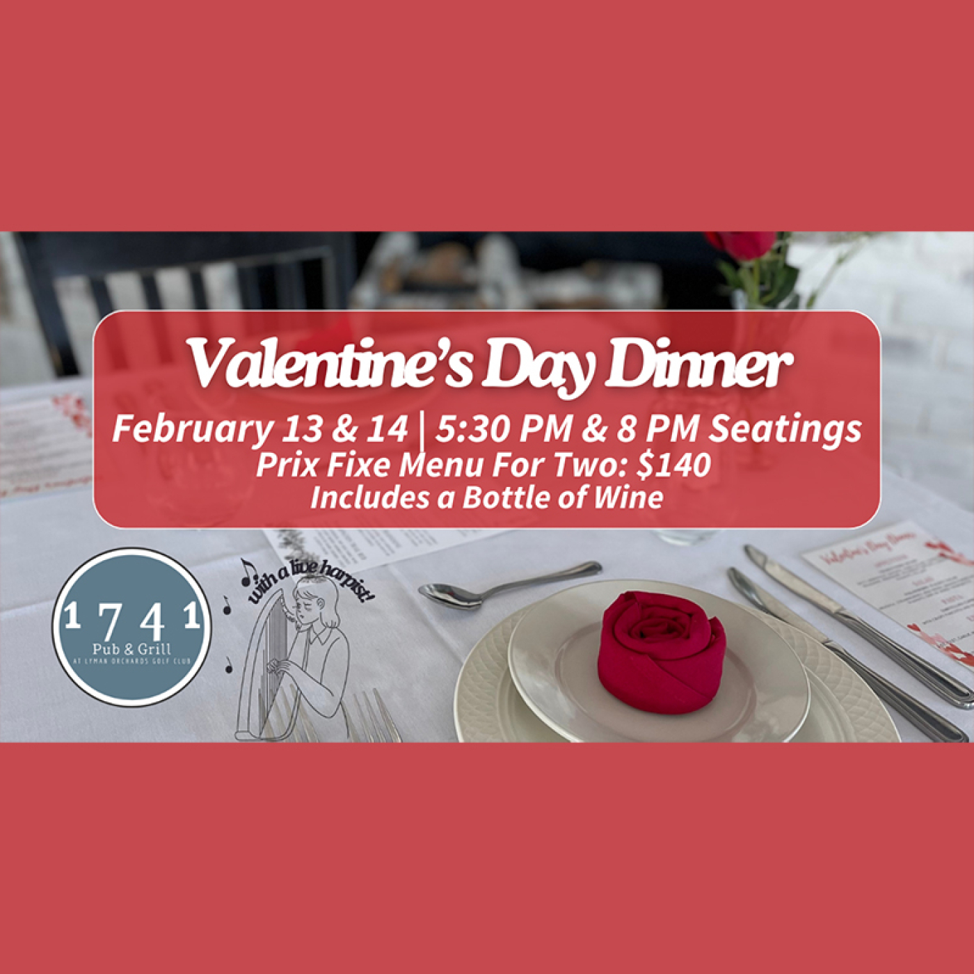 Valentine's Day Dinner with Live Harpist at 1741 Pub & Grill