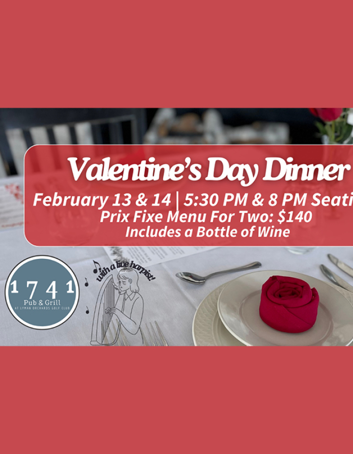 Sweep your Valentine off their feet with a romantic evening at 1741 Pub & Grill, complete with the elegant ambiance of a live harpist performing throughout the evening! Enjoy an expertly crafted prix fixe dinner for two on Friday, February 13th, or Saturday, February 14th, with seating at 5:30 PM or 8 PM. Each reservation includes a bottle of red or white wine and a menu designed to delight all the senses.