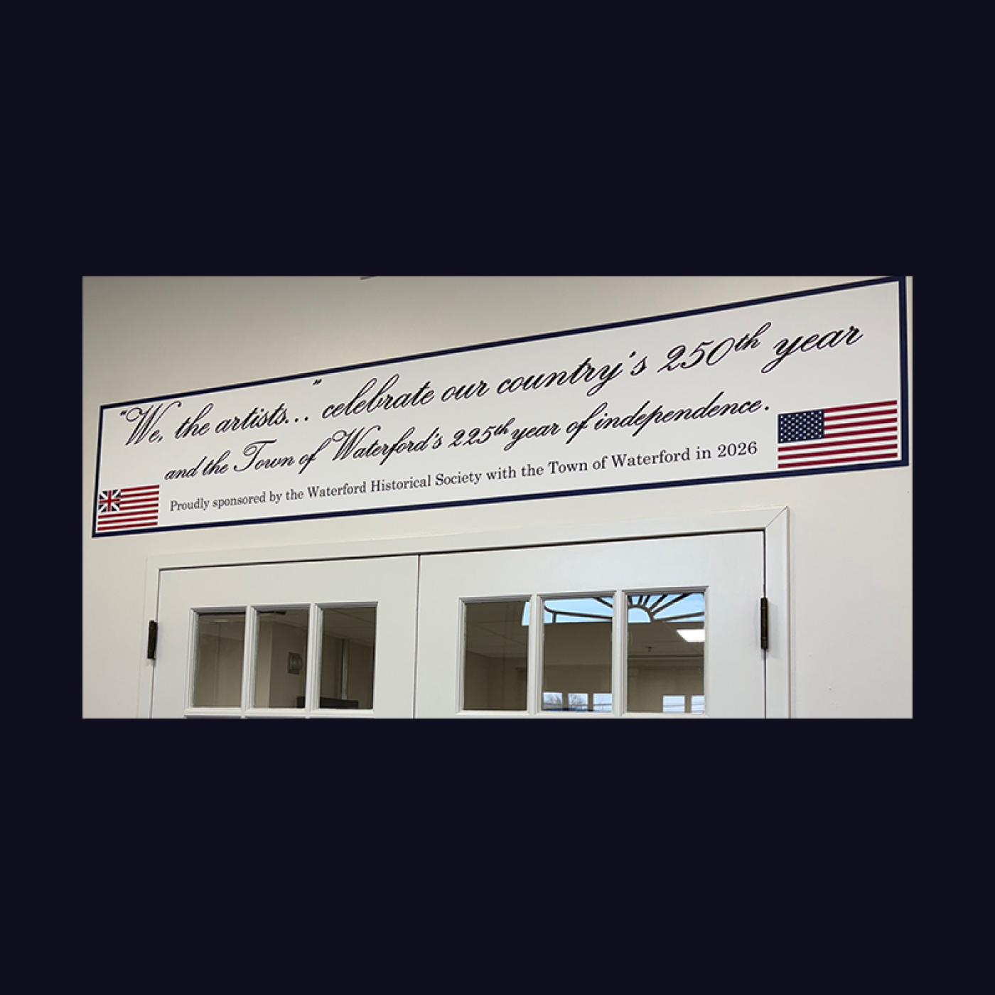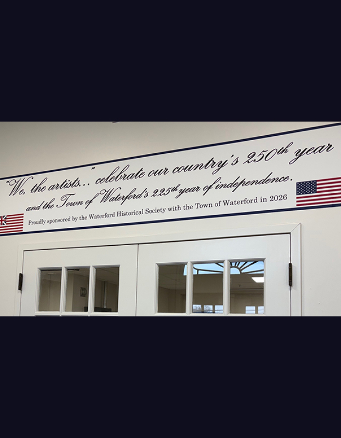 A banner over the doors at the Town Hall entrance proclaims “We, the artists … celebrate our country’s 250th year of independence and the Town of Waterford’s 225th year of independence.” On behalf of the Town of Waterford, First Selectman Rob Brule is collaborating with the Waterford Historical Society to display artwork throughout 2026 in the main hallway of Town Hall, providing a place for local artists to celebrate our country and the signing of the Declaration of Independence 250 years ago.
