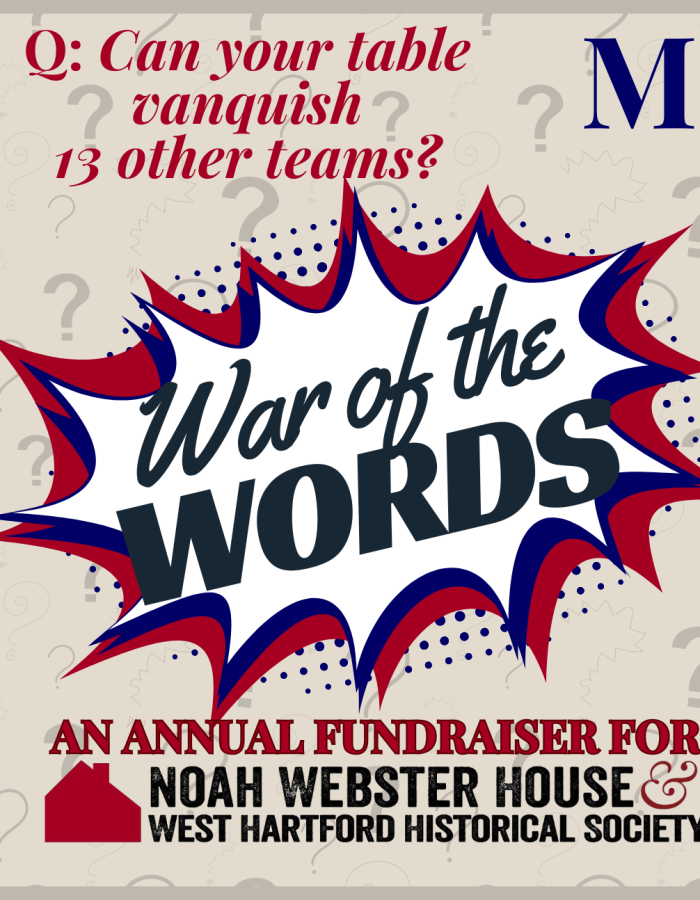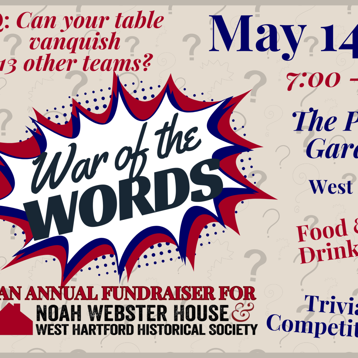 We are pleased to announce the return of Webster’s War of the Words fundraiser on May 14, 2026, to be held at the Pond House Garden Room at Elizabeth Park in West Hartford!