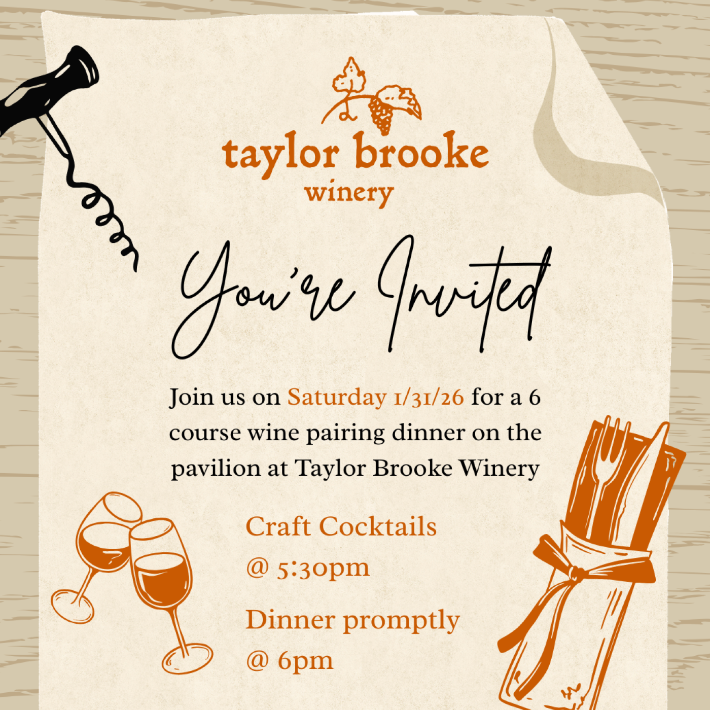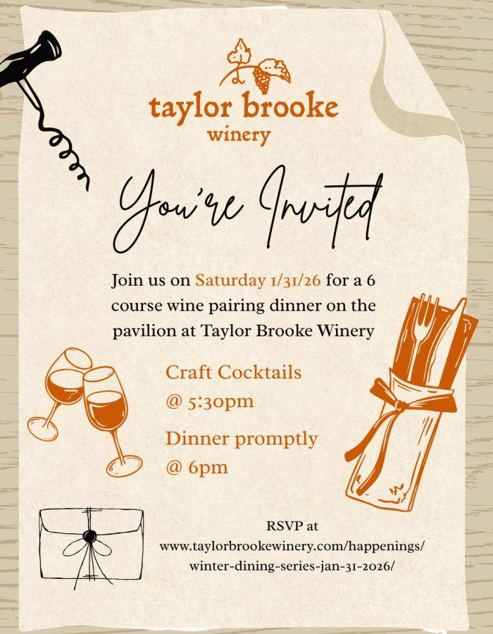 Join us on Saturday 1/31/26 for a 6 course wine pairing dinner on the pavilion at Taylor Brooke Winery. (Snow date 2/1/26)