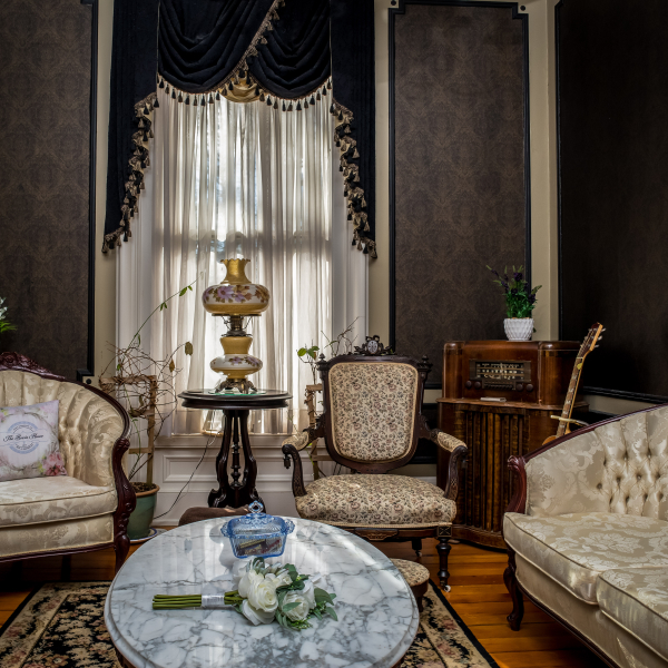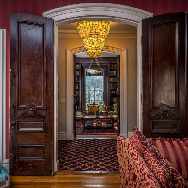 The Bevin House is a three-story French Empire style mansion and boasts a huge wrap around porch, original leaded windows, unique architectural details inside and out, a grand central hallway and staircase, library, music room, formal parlor, modern cook's kitchen and original outbuildings. The mansion has a total of 7,262 square feet, of which 4600 is living space, 12' ceilings 10' arched doors throughout, eight-foot windows, 15 rooms, four-and-a-half baths and seven bedrooms, six of which will be available for guests. Back in the day, this was the first home to have central heating in town.