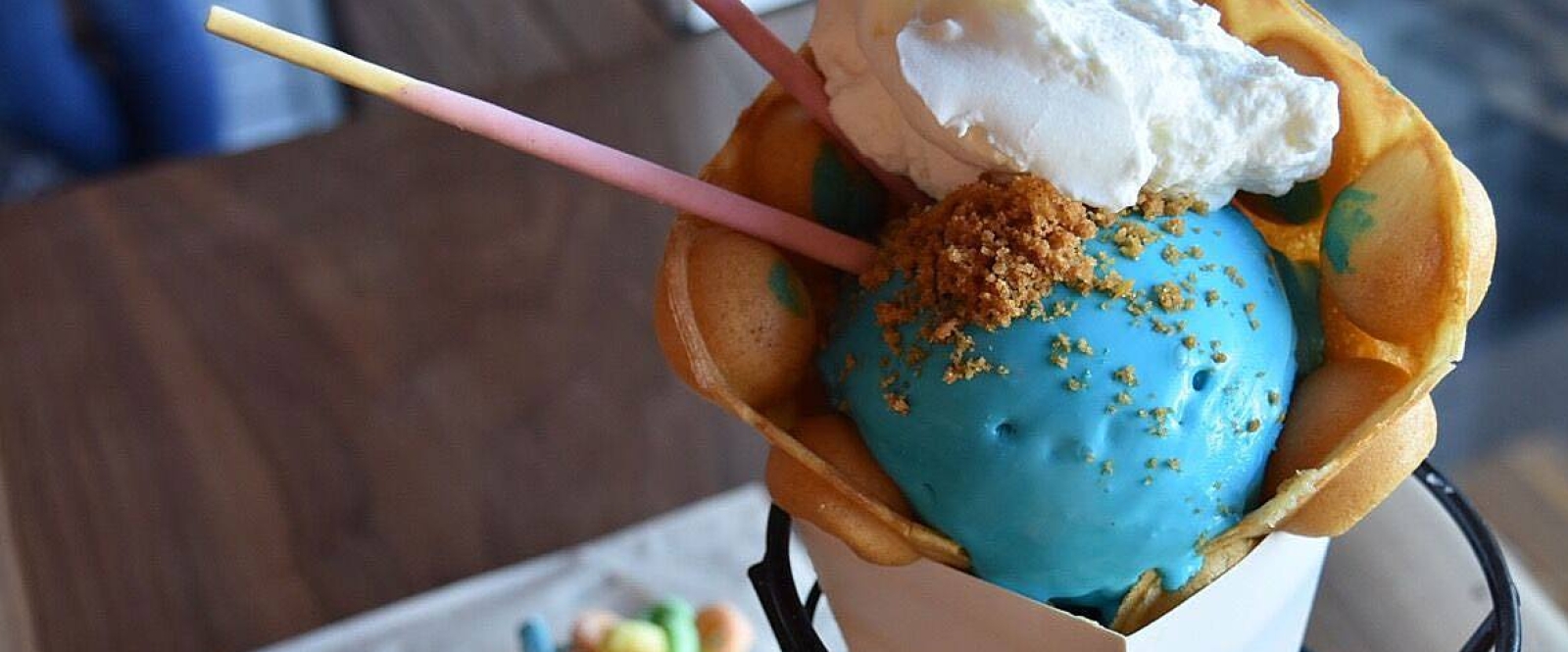Press your face against the glass and watch as your choice of ice cream flavor is flattened, churned and rolled to perfection at Icy Rolls.