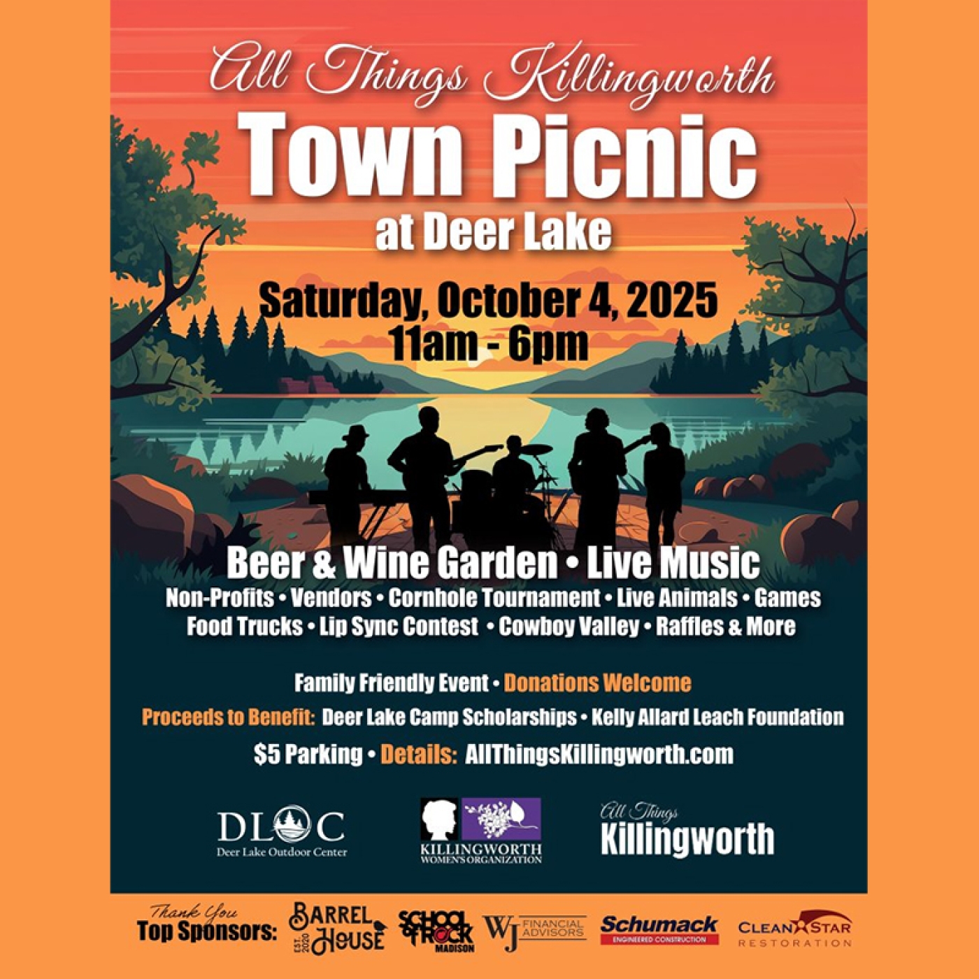 The All Things Killingworth Town Picnic at Deer Lake Outdoor Center returns Saturday, October 4th with a jam-packed day of entertainment, food, vendors, and family fun — all while raising funds for two important local causes. From the magical Sanderson Sisters of Hocus Pocus to a nostalgic Cowboy Valley Tribute, a bubble-filled adventure, live bands, and contests galore, this year’s picnic promises to be the best yet.