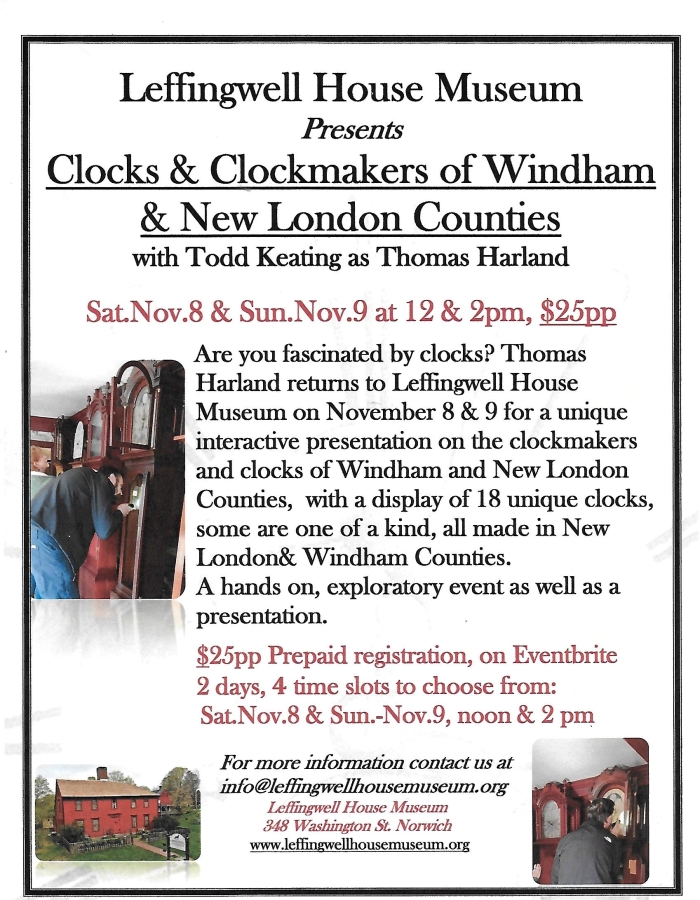 Are you fascinated by clocks? Thomas Harland returns to Leffingwell House Museum on November 8 & 9 for another unique interactive presentation of the clockmakers of Windham and New London Counties, with a new clock display of 18 unique clocks, some are one of a kind, all made in New London & Windham Counties. This will be a hands on, exploratory event as well as a presentation.